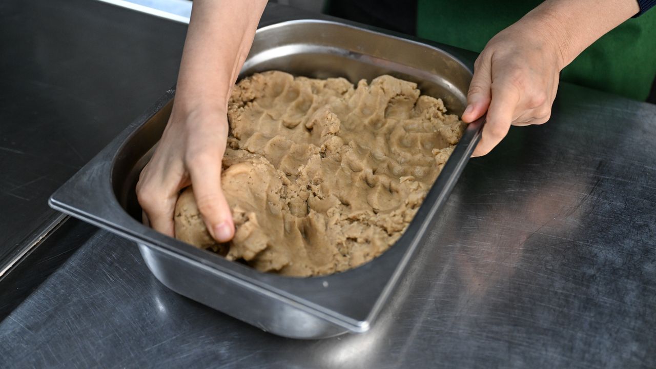 4. Susama batırılan hamur, daha sonra geleneksel tahta kalıba yerleştirilir.