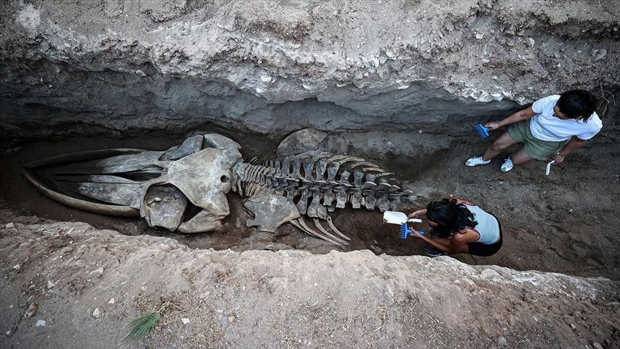 İki gün içinde iskeletin tamamı topraktan çıkarılacakProjeyi yürüten MEÜ Su Ürünleri Fakültesi İşleme Teknolojisi Ana Bilim Dalı Öğretim Üyesi Prof. Dr. Ayas da kazı çalışmalarında 4. günü geride bıraktıklarını kaydederek, 'Şu an kafa, boyun omurları ve göğüs bölgesinin tamamını toprak altından çıkarttık. Bel ve kuyruk omurları kısmı kaldı. İki gün içerisinde de tüm iskeleti müzemizin bahçesinde çıkartmayı planlıyoruz.' bilgisini verdi.
