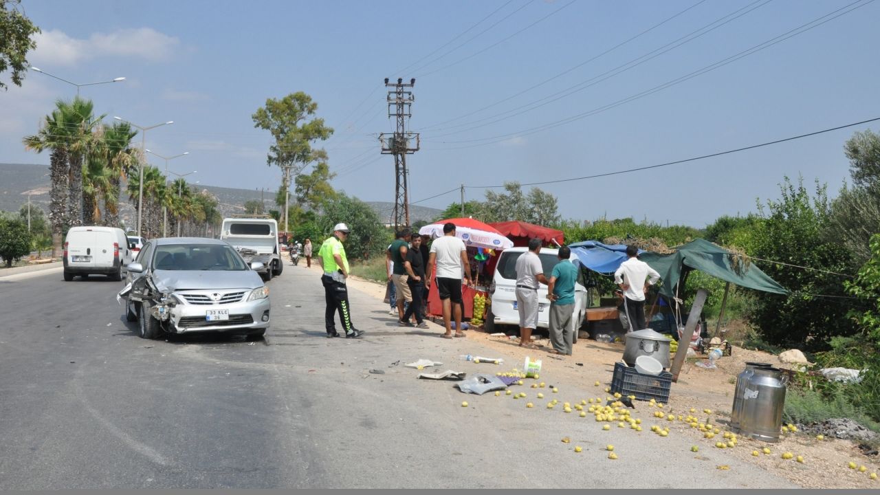 Çarpmanın etkisiyle ilerleyen araç, yol kenarında meyve sebze satışı yapılan tezgahları devirdi.