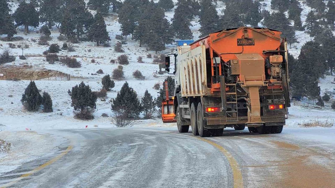 Mersin Büyükşehir Belediyesi ekipleri, Mut ilçesinin yüksek kesimlerinde etkili olan kar yağışı sonrasında kar küreme ve tuzlama çalışmaları yaparak kırsalda yolları açık tutmaya çalışıyor.