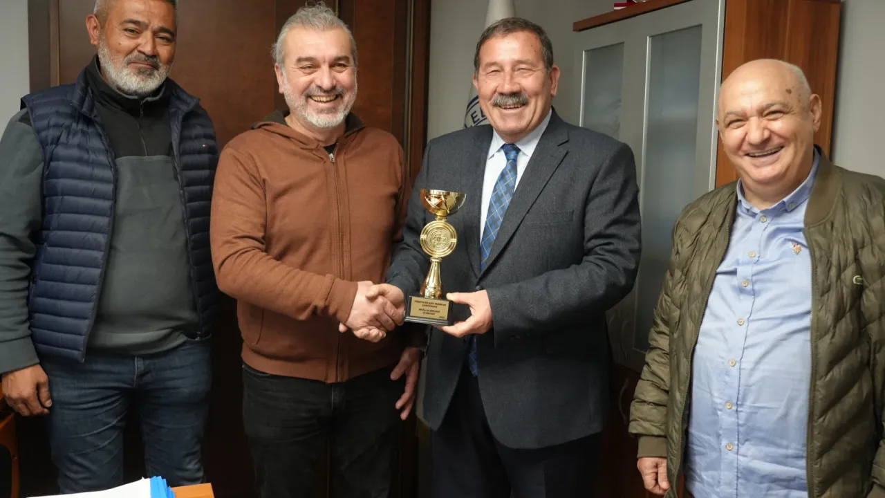 Milas Belediye Spor Briç Takımı oyuncuları Süleyman Koç ve Nevzat Aydoğdu üçüncülük kupası ile birlikte Milas Belediye ve Milas Belediye Spor Kulüp Başkanı Fevzi Topuz’u makamında ziyaret etti.