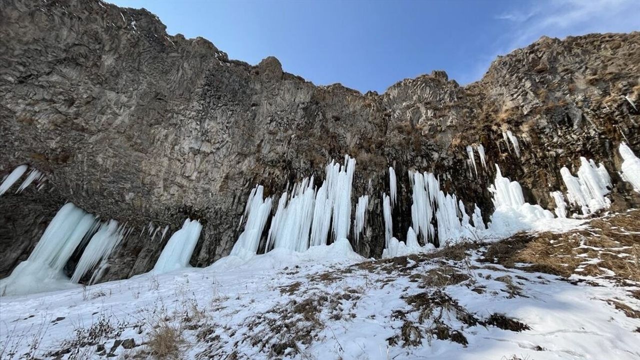 Zorlu kış şartlarının yaşandığı bölgede yer alan kanyonun sarp kayalıklarında soğuğun etkisiyle metrelerce uzunlukta buz sarkıtları oluştu.