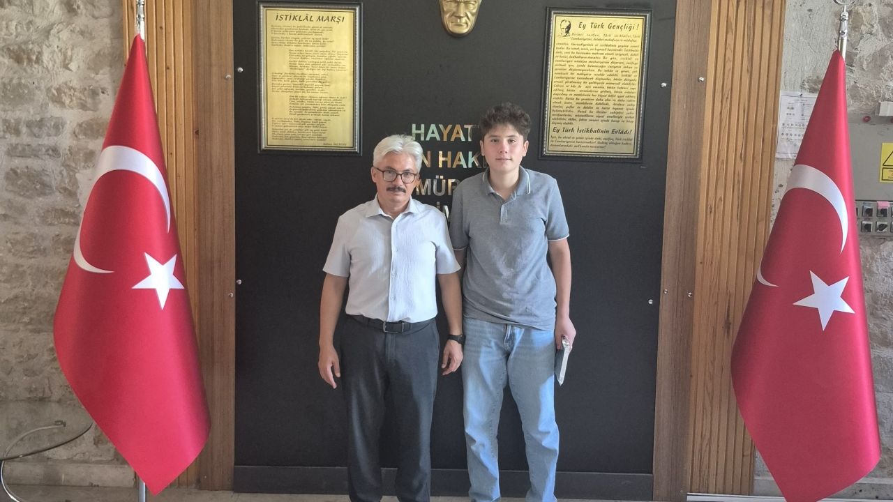 MERSİN (AA) - Mersin'in Mut ilçesinde, Liselere Geçiş Sistemi (LGS) kapsamındaki merkezi sınavda 500 tam puan alan Abdullah Asım Şahin, İlçe Milli Eğitim Müdürü Erdal Dölek'i ziyaret etti.