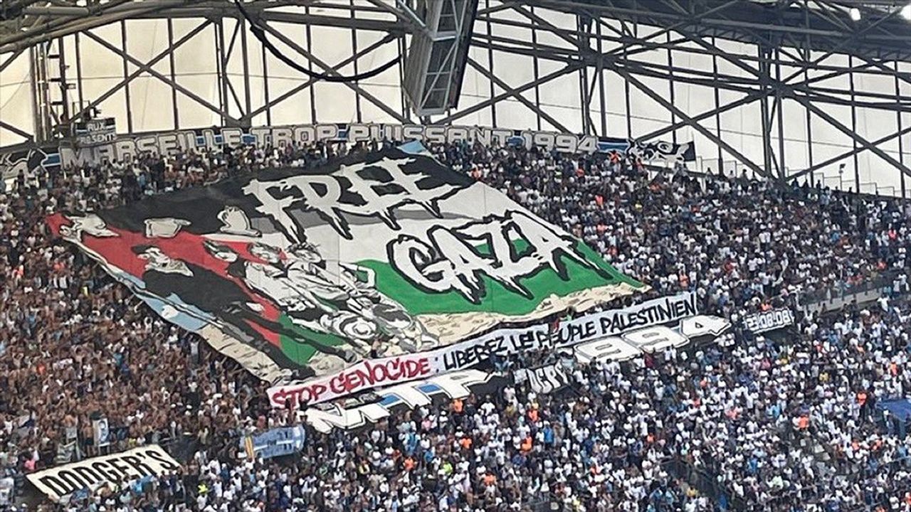 İSTANBUL (AA) - Fransa Ligue 1'in 2. haftasında Velodrome Stadı'nda Paris FC'yi konuk eden ve maçtan 5-2'lik galibiyetle ayrılan Olimpik Marsilya'da taraftarlar Özgür Gazze (Free Gaza) yazılı dev bir pankart açarak tepkilerini ortaya koydu.