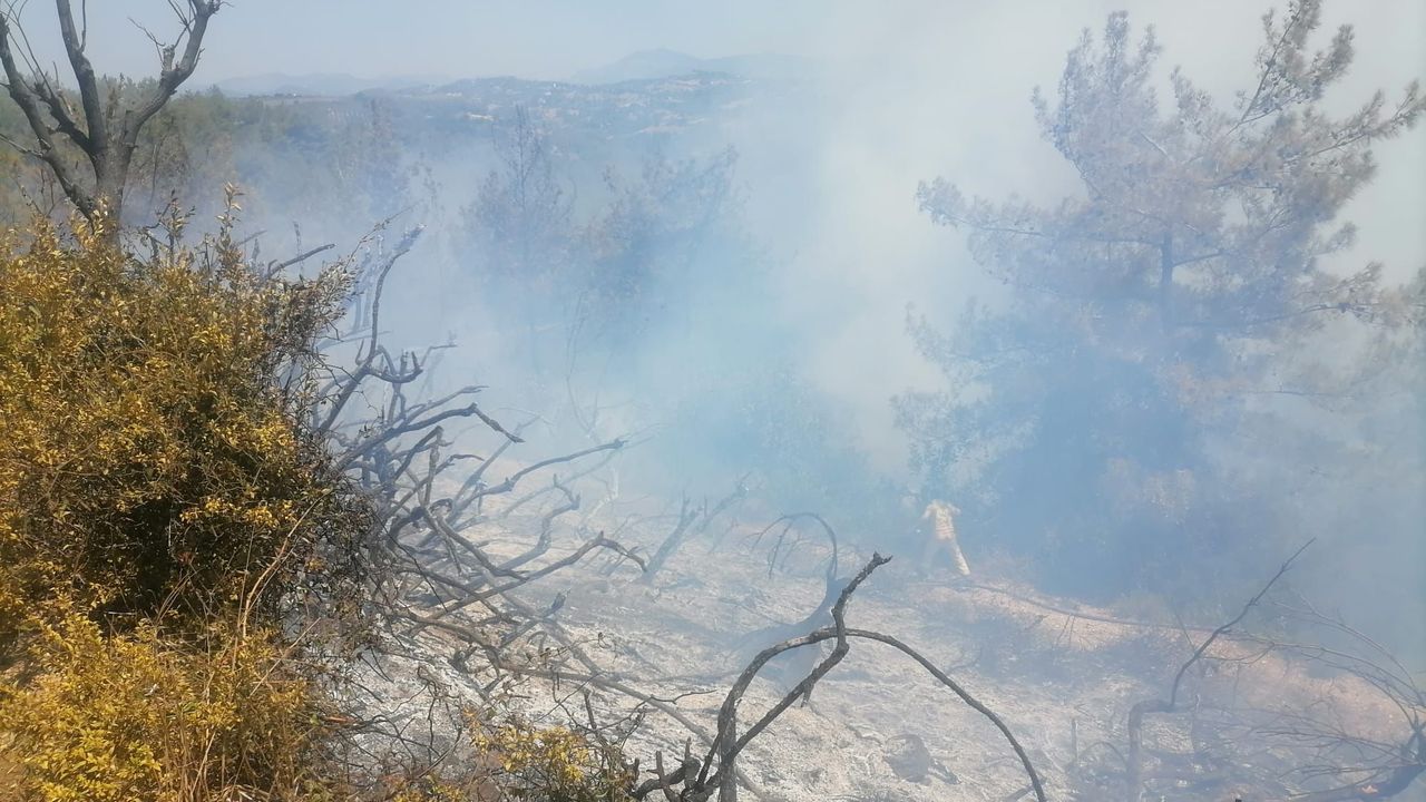 Soğutma çalışmalarının sürdüğü yangında, ilk tespitlere göre 4 dekarlık orman alanı zarar gördü.