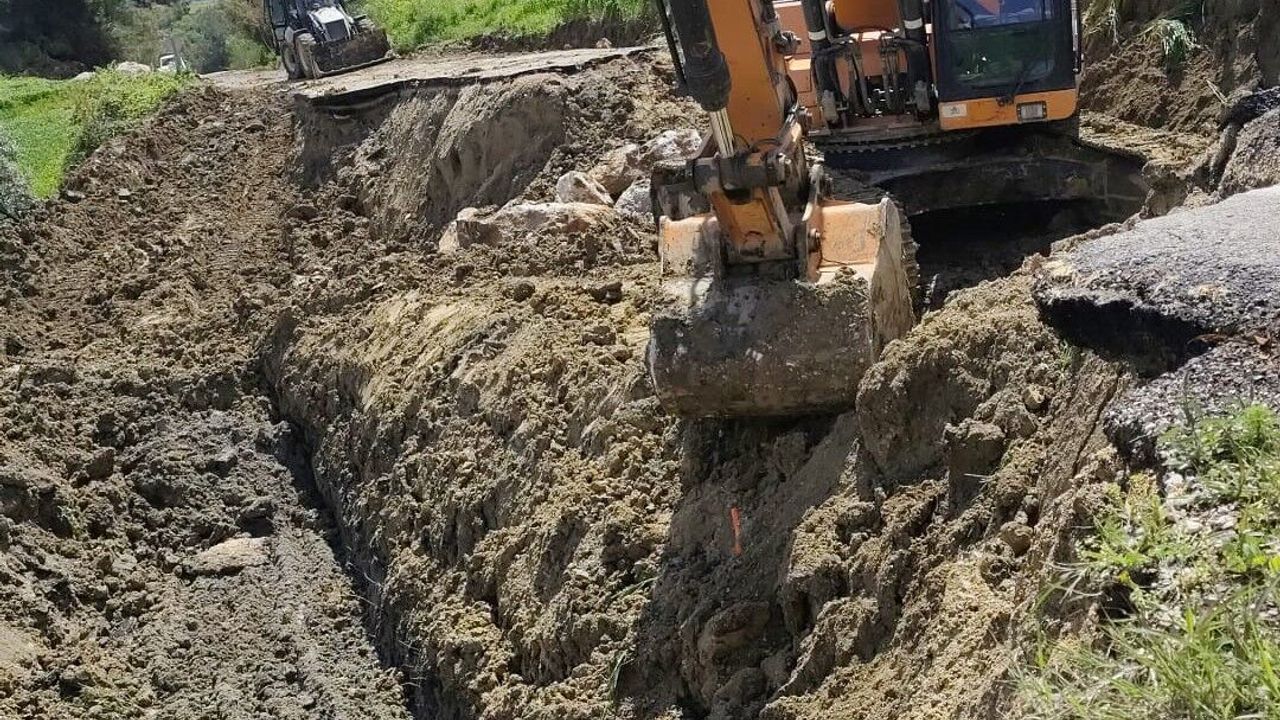 OSMANİYE (AA) - Osmaniye'nin Kadirli ilçesinde sağanak nedeniyle çöken ve ulaşıma kapanan köy yolunda ekiplerin çalışması devam ediyor.