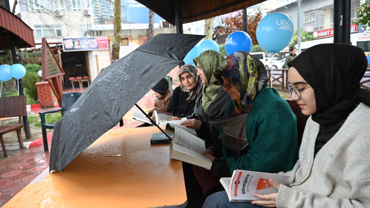 Programa katılan aralarında çocukların da olduğu grup, yağmurda bank ve kameriyelerin yanı sıra ayakta şemsiye altında yarım saat kitap okudu.
