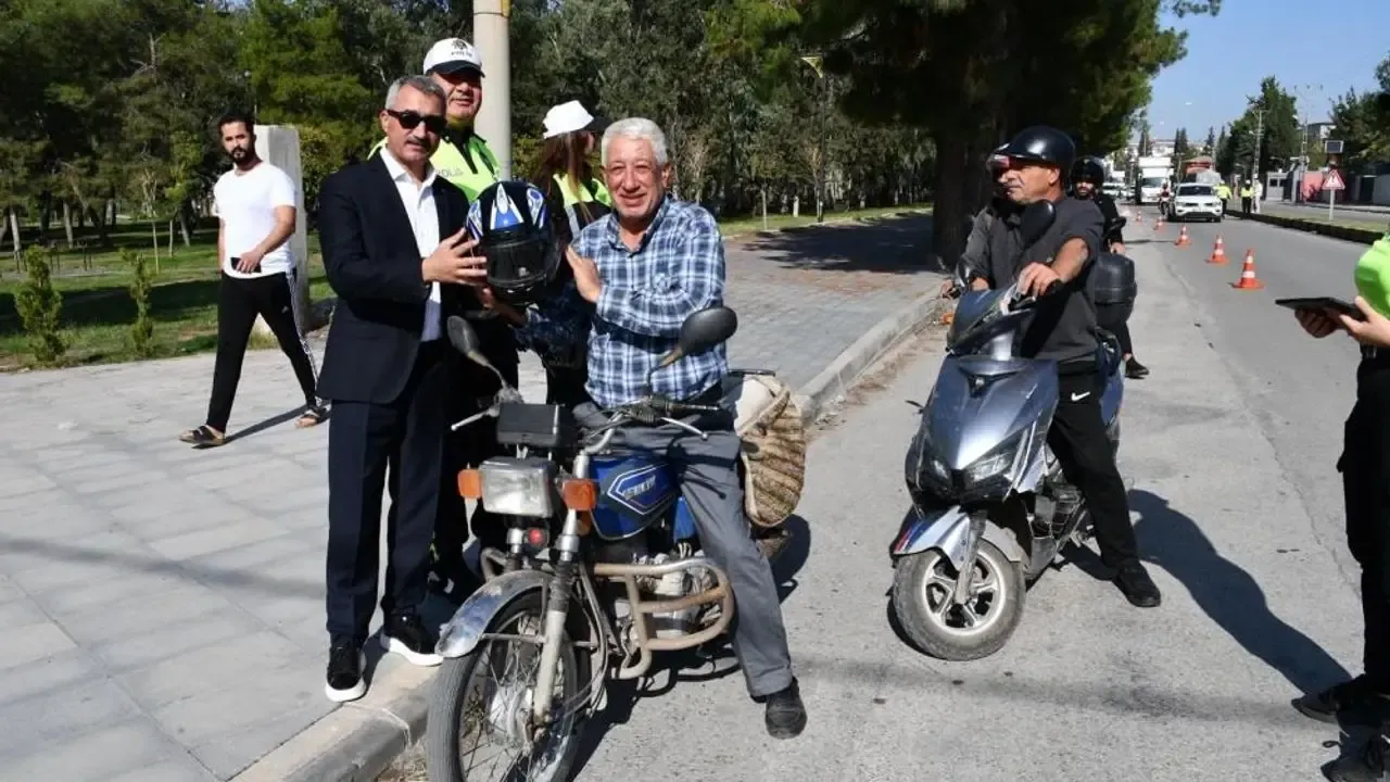 İlçe Emniyet Müdürlüğü ekipleri tarafından düzenlenen uygulamada, motosiklet sürücülerine kask takmanın önemi anlatıldı ve kasksız trafiğe çıkan sürücülere ücretsiz kask dağıtıldı.
