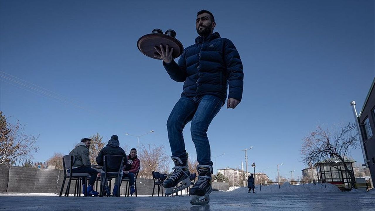 İşletmesinin bahçesindeki yaklaşık 200 metrekare alanı suyla doldurarak dondurucu soğukların yaşandığı kentte doğal buz pistine dönüştüren Koç, üzerine de masa ve sandalye yerleştirip, müşterilerine paten kayarken yeme içme imkanı sunmaya başladı.