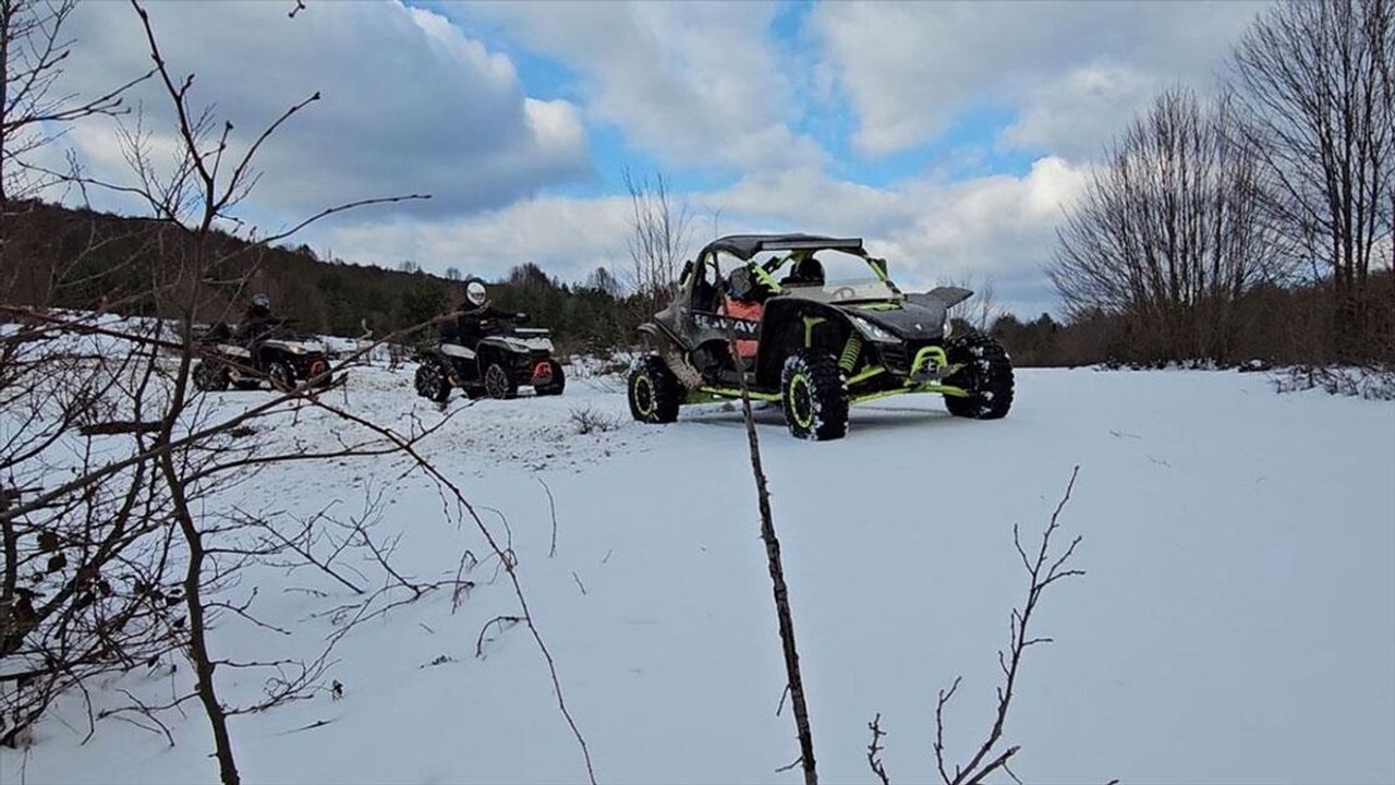 Sürücüler, karla kaplı patikalarda ilerleyerek hem doğanın tadını çıkarıyor hem de belirli noktalarda durarak beyaz örtüyle kaplanmış dağları ve ormanları görüntülüyor.