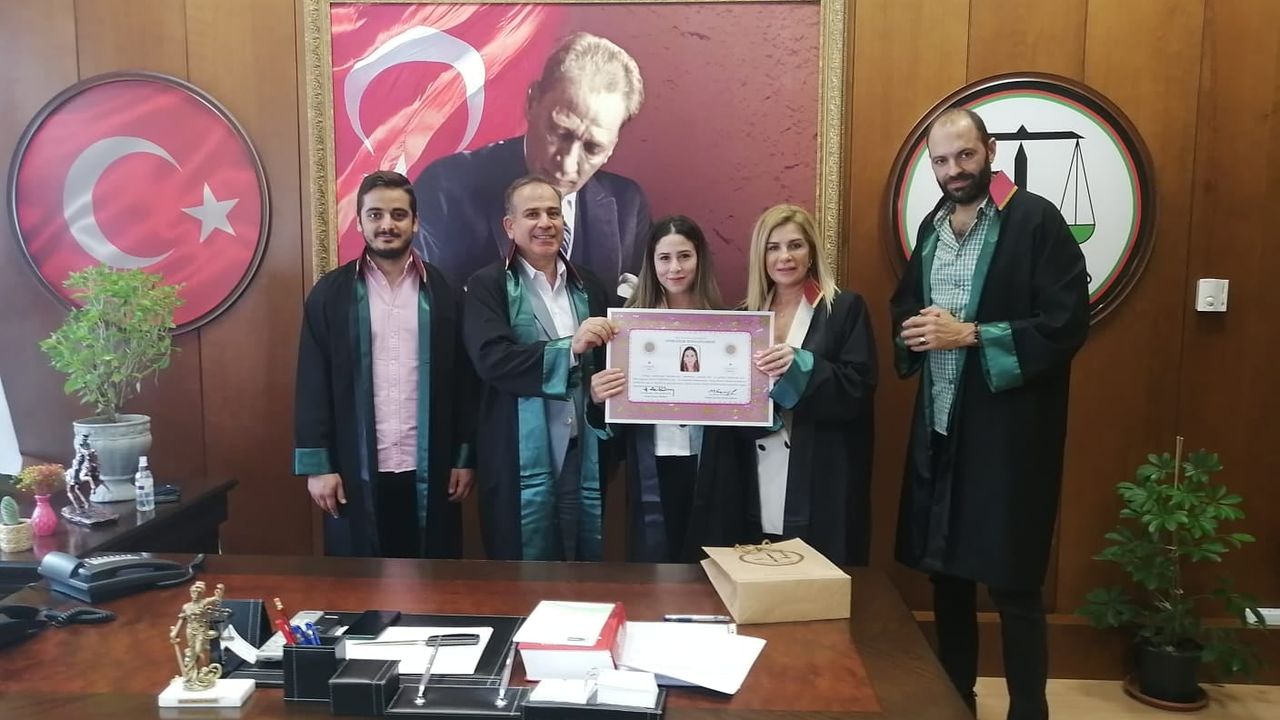 Staj dönemini başarıyla tamamlayan Sevgi Terzioğlu, Hatay Adliyesinde düzenlenen yemin töreni ile ruhsatını Hatay Baro Başkanı Av. Cihat Açıkalın'ın elinden aldı.