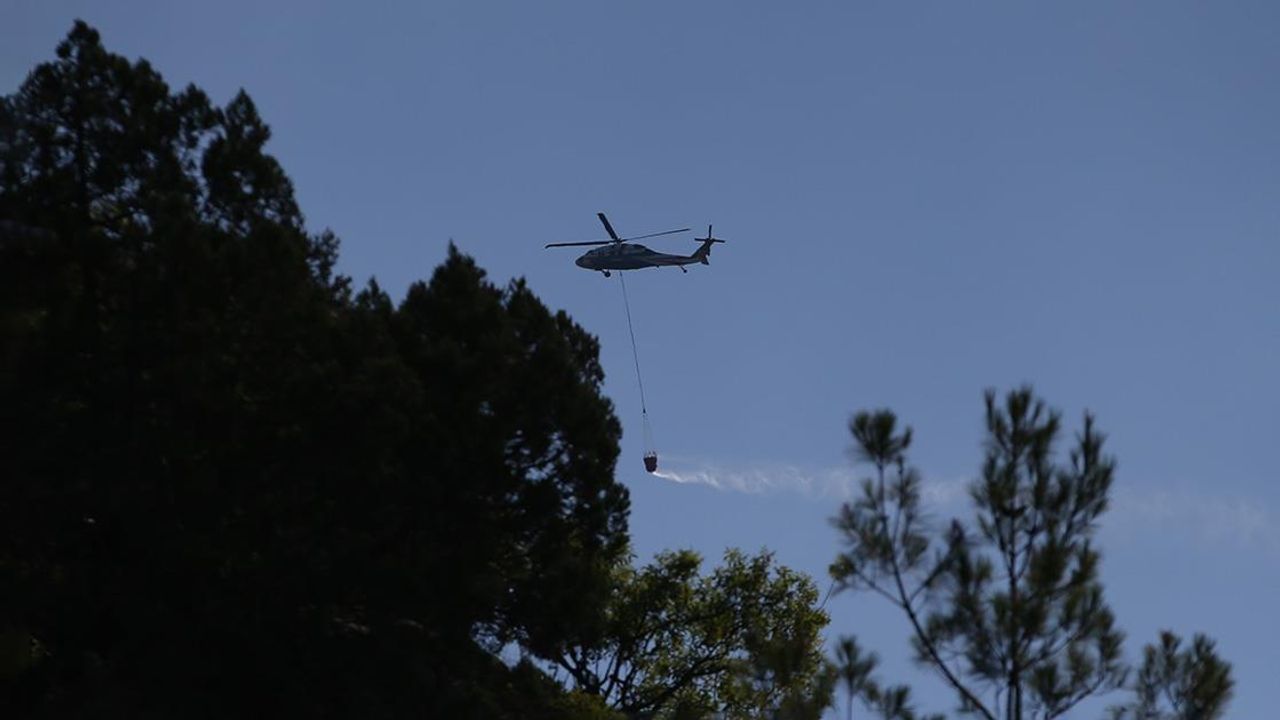 Yangına yakın bölgede bulunan ırmaktan su alan helikopterler, yangını söndürme faaliyetlerini yoğun şekilde sürdürüyor.