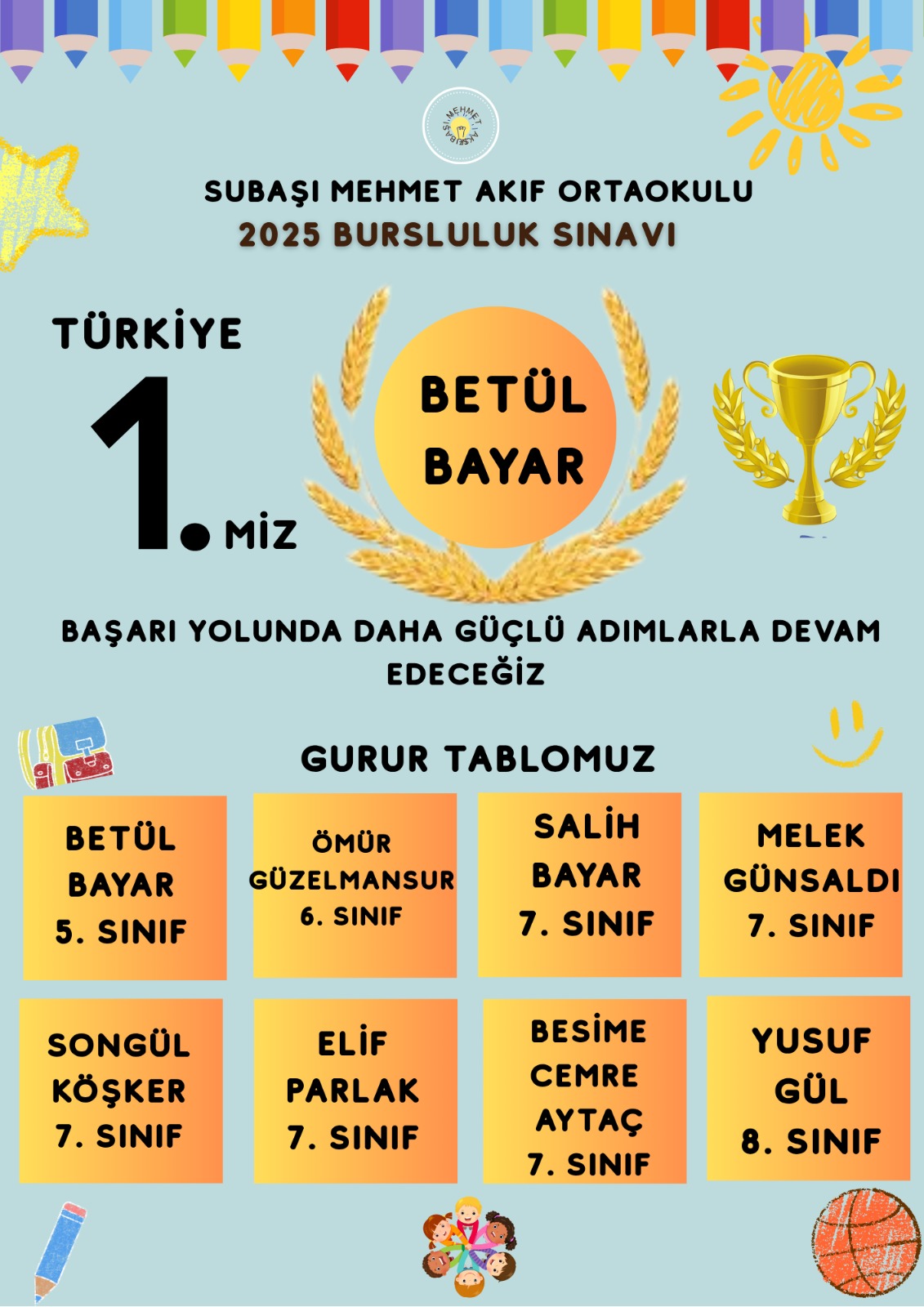Subaşı Mehmet Akif Ortaokulu, 2025 Bursluluk Sınavı'nda elde ettiği tarihi başarıyla adından söz ettirdi. Okulun 5-B sınıfı öğrencilerinden Betül Bayar, 500 tam puan alarak Türkiye birincisi oldu. Bayar’ın bu önemli başarısı, okul camiasında büyük gurur ve sevinçle karşılandı.