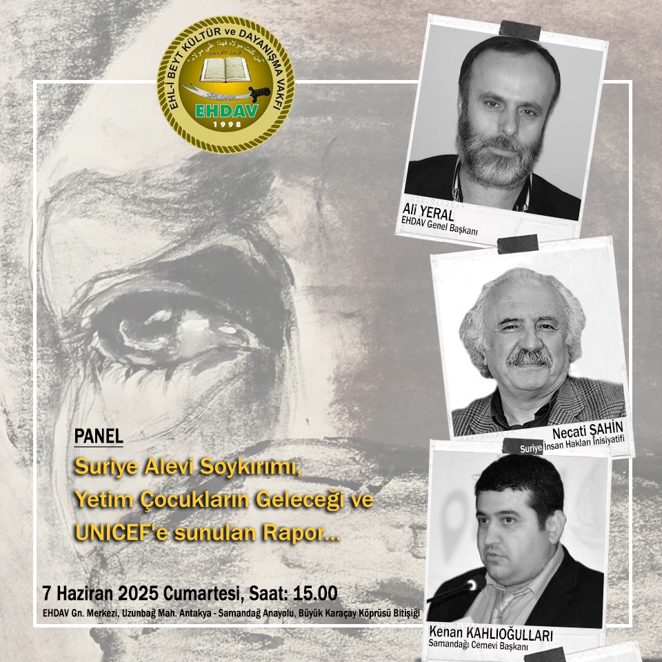 Ehli Beyt Kültür ve Dayanışma Vakfı (EHDAV), 7 Haziran 2025 Cumartesi günü saat 15.00’te Antakya’nın Samandağ ilçesinde çarpıcı bir panele ev sahipliği yapacak. “Suriye Alevi Soykırımı, Yetim Çocukların Geleceği ve UNICEF’e Sunulan Rapor” başlıklı panel, EHDAV Genel Merkezi’nde gerçekleştirilecek.