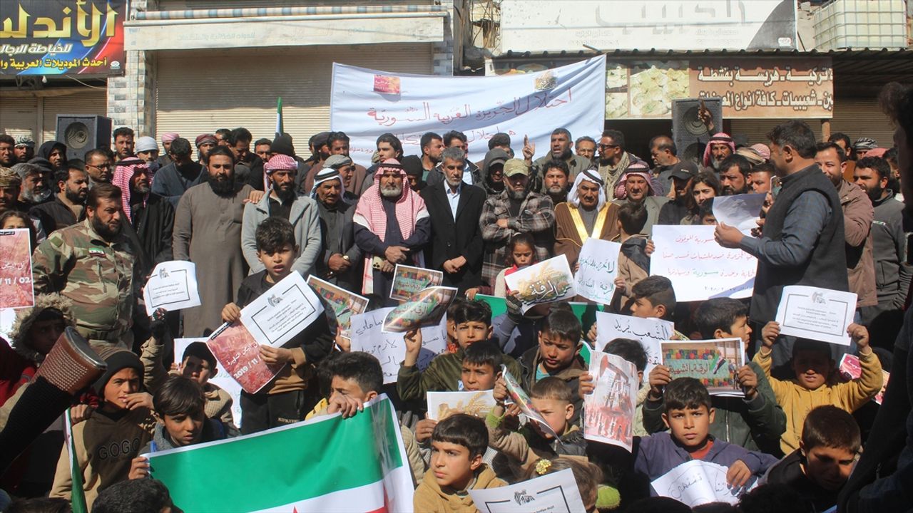 Bir araya gelen siviller, "Beyefendiler devrim bitmedi. Suriye'nin yarısı işgal altında", "Suriye'nin bölünmesini kabul etmiyoruz" yazılı pankartlar açtı.