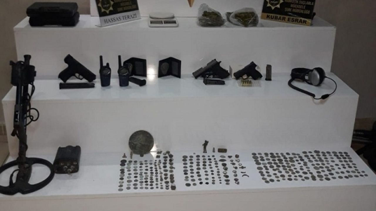 Aramada, tarihi eser olduğu değerlendirilen farklı dönemlere ait 282 sikke, 41 yüzük, ok ve kolye ucu, 4 mühür, 18 taş obje, 2 kırık yüzük parçası, metal dedektör, 2 polis rozeti bulunan sahte cüzdan ve 2 amatör telsiz ile 80 gram esrar, hassas terazi, 2'si kurusıkı 3 tabanca, fişek, şarjör ele geçirildi.