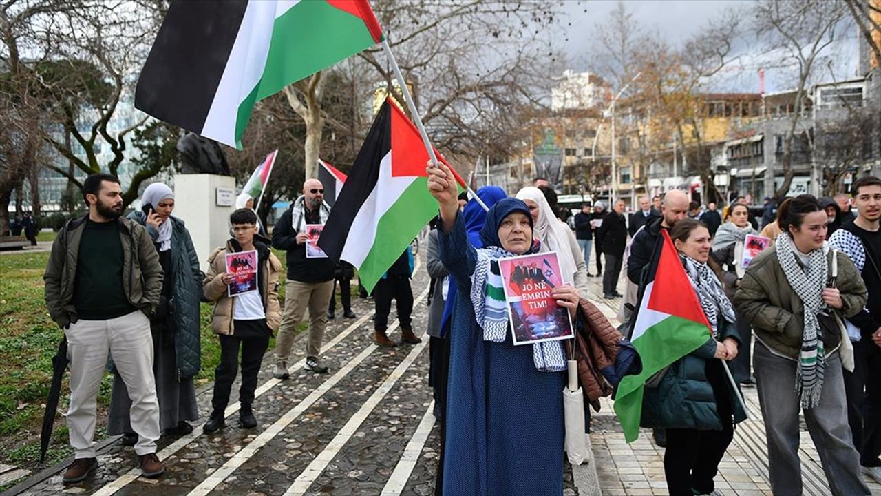 Organizatörler, protestonun amacına ilişkin 'Bugün burada, tüm dünyanın gözleri önünde büyük bir yıkım ve soykırım yaşayan Gazze ve Filistinliler için bulunuyoruz. Bugün aynı zamanda Arnavutluk için de buradayız.' ifadelerini kullandı.