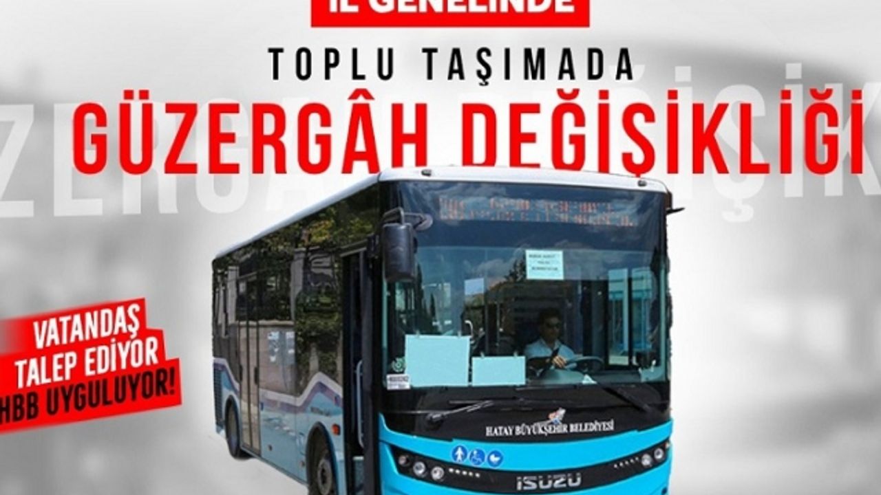 Hatay Büyükşehir Belediyesi (HBB), Antakya- Defne (100 No.lu hatlar), Üniversite- Serinyol (200 No.lu hatlar), Harbiye (300 No.lu hatlar) ile Samandağ- Antakya(400 No.lu hatlar) bölgelerinde hizmet veren özel halk otobüslerinin güzergâhlarında düzenleme yapıldığını duyurdu.