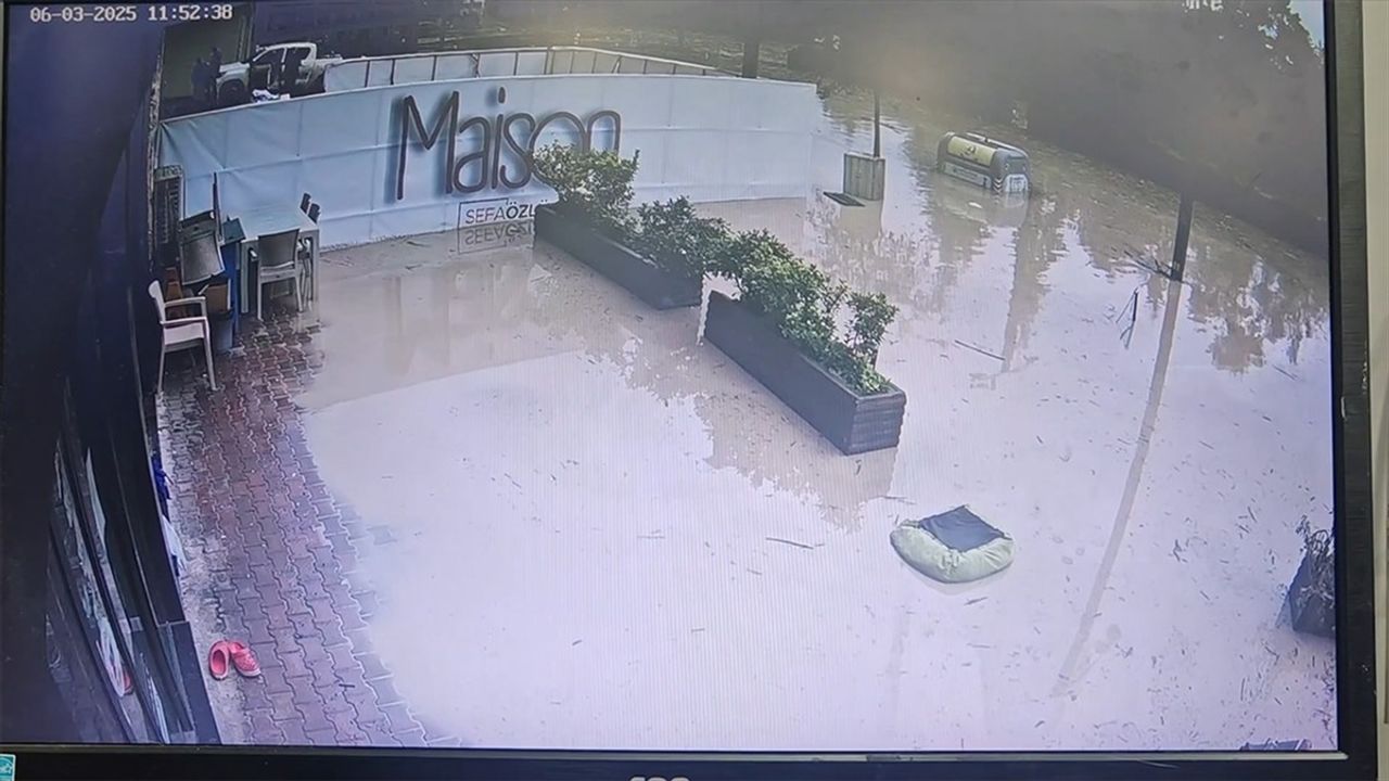 Öte yandan taşkın sırasında yolda suyun yükselme anı, Beşirli Mahallesi'ndeki bir iş yerinin güvenlik kamerasınca kaydedildi.