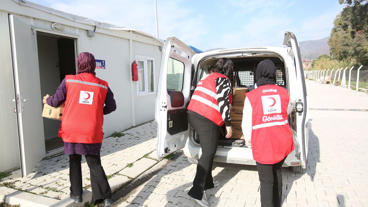 Afetzedelerle bir araya gelen Türk Kızılay görevlileri, 70 haneye hijyen malzemelerinin yer aldığı kolileri ulaştırdı.