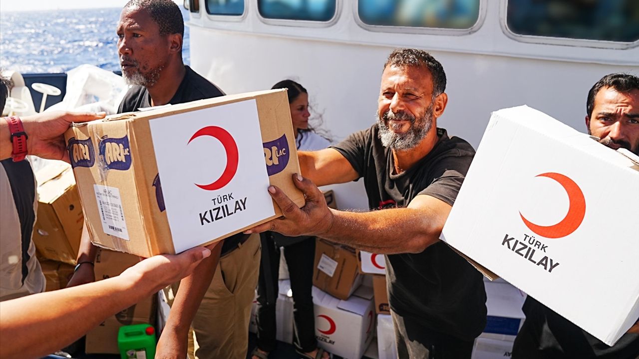 Türk Kızılay ekibi, teknelere ulaşarak gıda ve ilaç yardımlarını teslim etti.