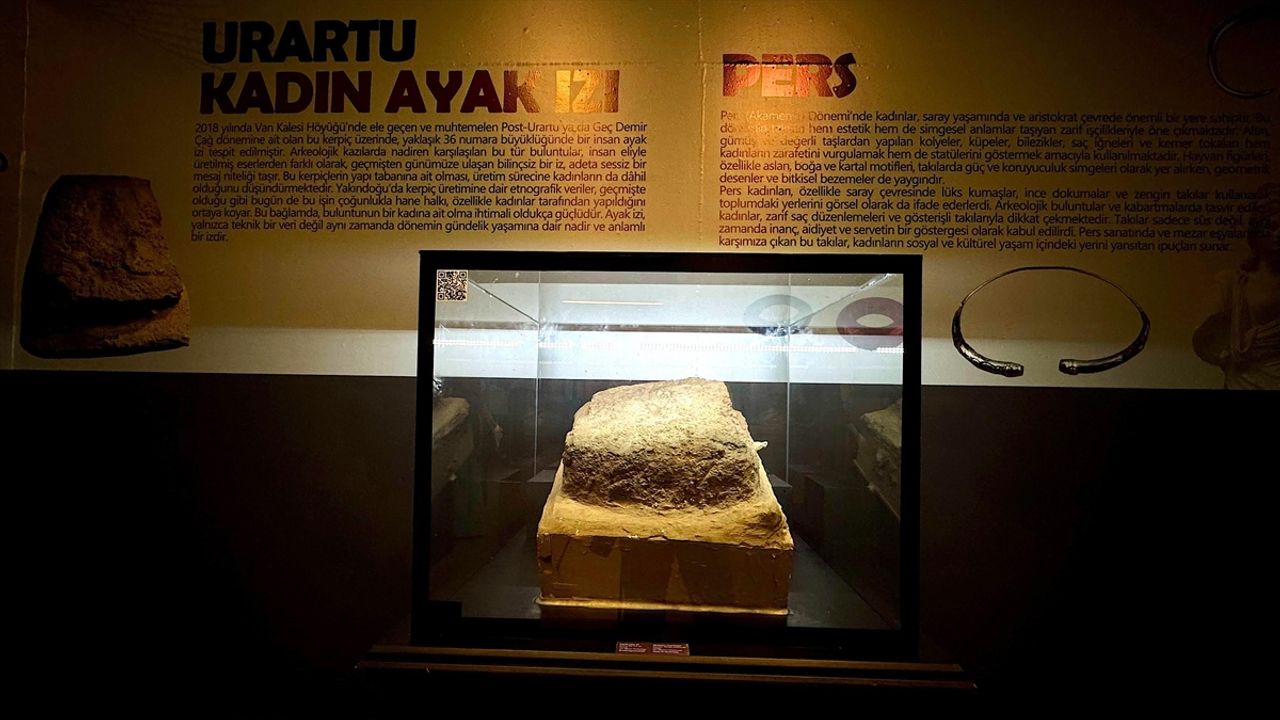 VAN (AA) - Van Kalesi'nin kuzeyindeki höyükte yürütülen kazı çalışmaları sırasında ortaya çıkarılan Urartu kadınına ait ayak izi, 100+2 Süreli Müze Sergileri Projesi kapsamında ilk kez Van Müzesi'nde görücüye çıktı.