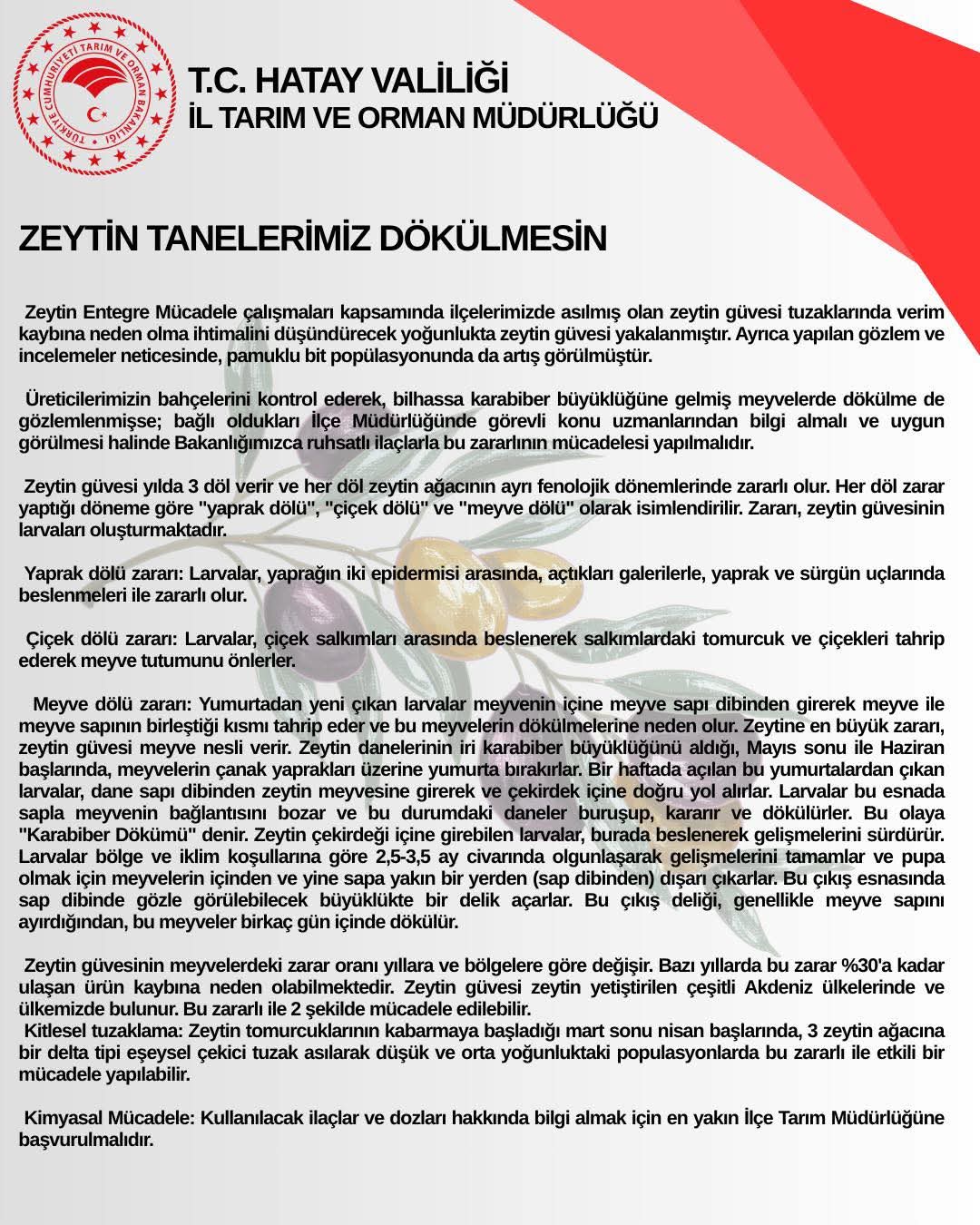 Zeytin üreticilerimizin bu dönemde dikkatli olmaları, gözlem ve kontrolleri sıklaştırmaları büyük önem taşımaktadır.