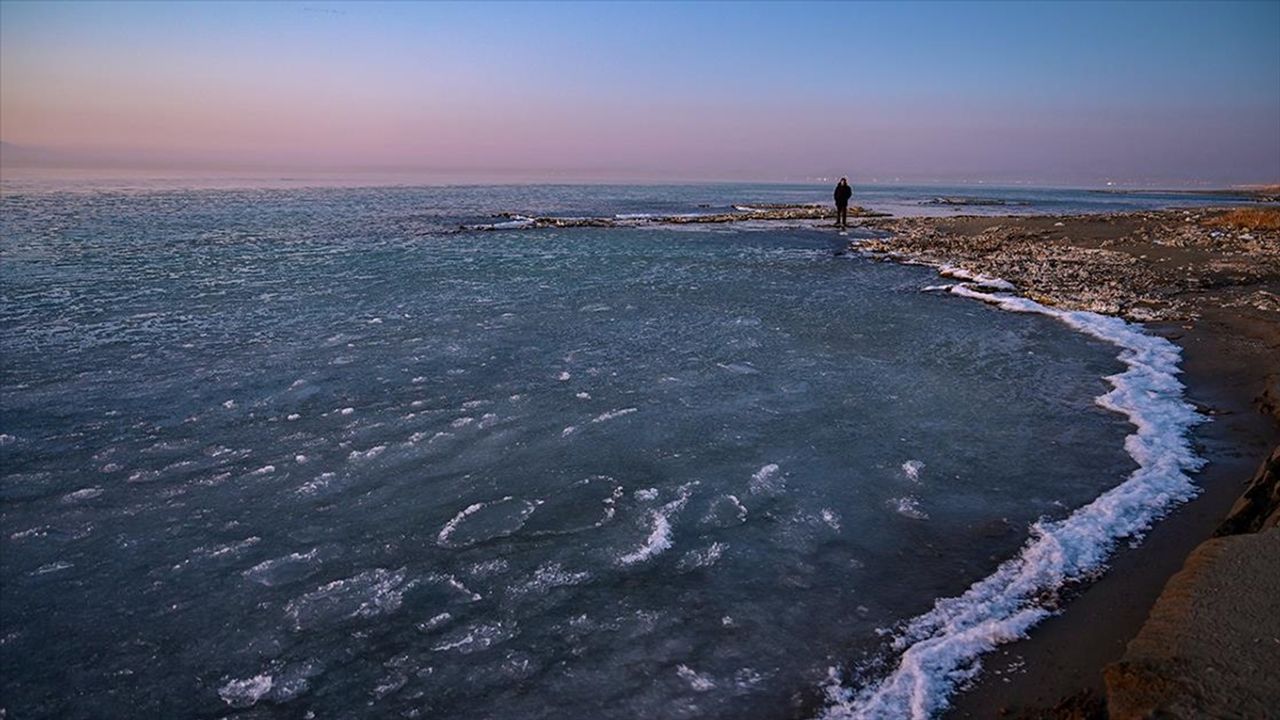 VAN (AA) - Dünyanın en büyük sodalı gölü olan Van Gölü'nün yüzeyi, soğuk havanın etkisiyle yer yer buz parçacıklarıyla kaplandı.