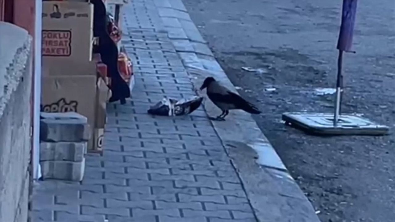 Kaldırımda cips paketini gagasıyla açan karganın, cipslerden birkaç tanesini alarak uzaklaşması cep telefonu kamerasına yansıdı.