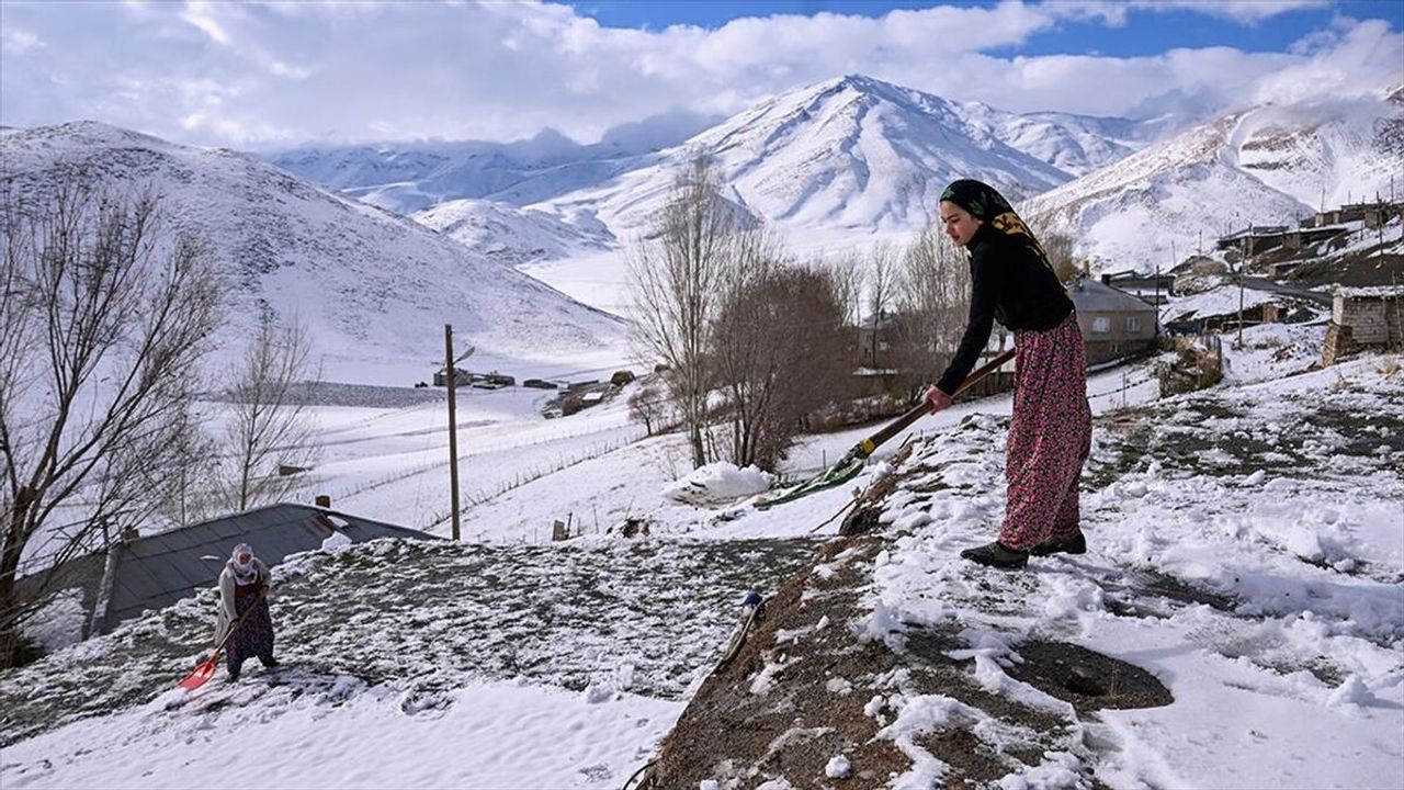 Bazı vatandaşların evlerin damlarında biriken karı temizlediği Bahçesaray ve Çatak'ta, çocuklar da kar yağışını eğlenceye dönüştürdü.