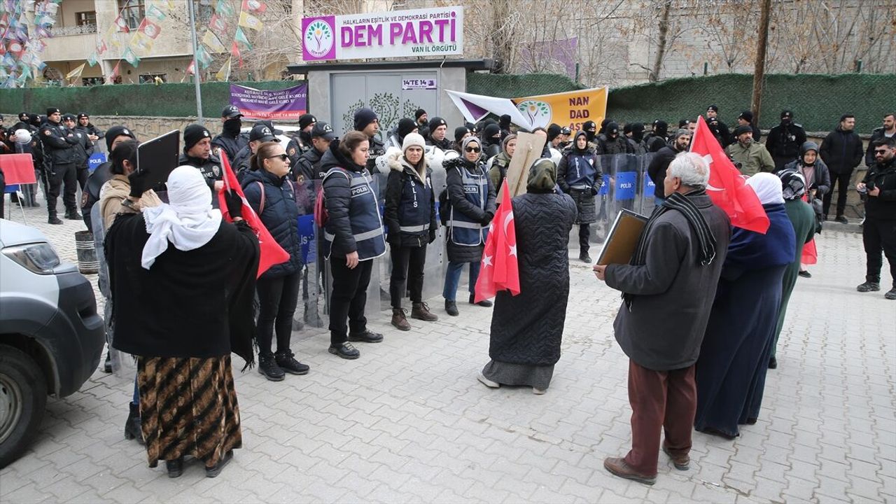 VAN (AA) - Menekşe Sokak'ta bir araya gelen aileler, Türk bayrakları ve evlatlarının fotoğraflarını taşıyarak DEM Parti İl Başkanlığı binasının önüne kadar yürüdü.