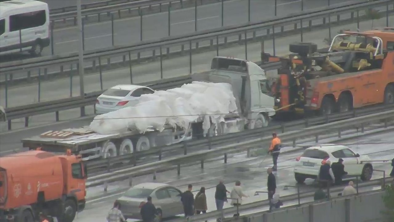 İSTANBUL (AA) - Beştelsiz Mahallesi’nde D-100 kara yolu Cevizlibağ istikametinde bariyere çarpan tırda, çuvallar içeresindeki alçılar yola döküldü.